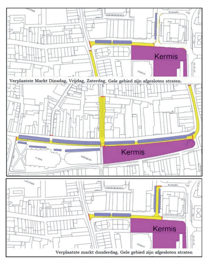 De verplaatsing duurt tot het einde van de kermis op maandag 21 mei. Op de kaart hieronder is te zien waar de markt naartoe verplaatst wordt en op welke dagen.