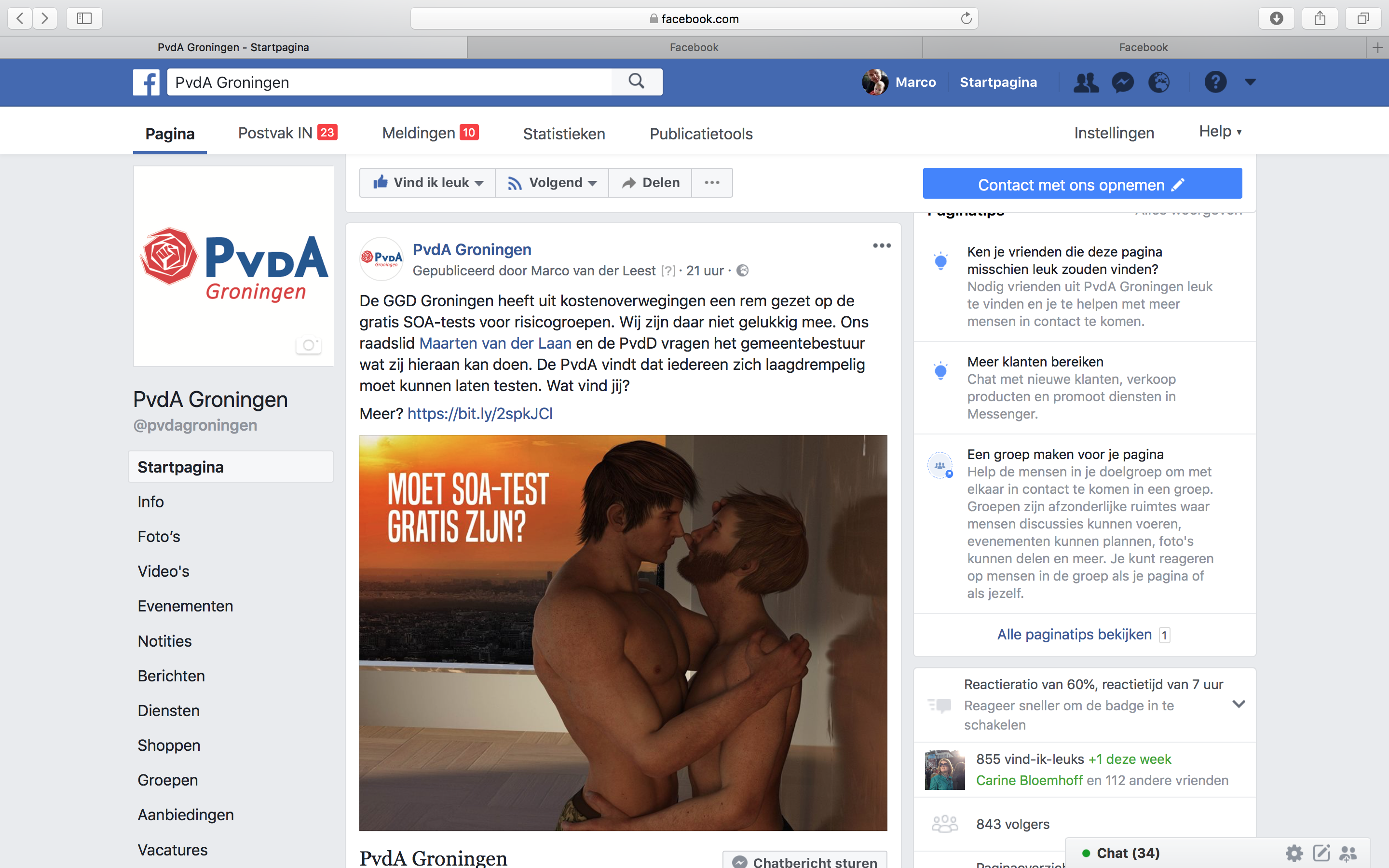 Fractievoorzitter Carine Bloemhoff van de PvdA Groningen is boos op Facebook. Facebook verwijderde afgelopen weekend een bericht waarin de PvdA aandacht vraagt voor gratis SOA-tests voor risicogroepen. Op die afbeelding staan twee zoenende mannen.