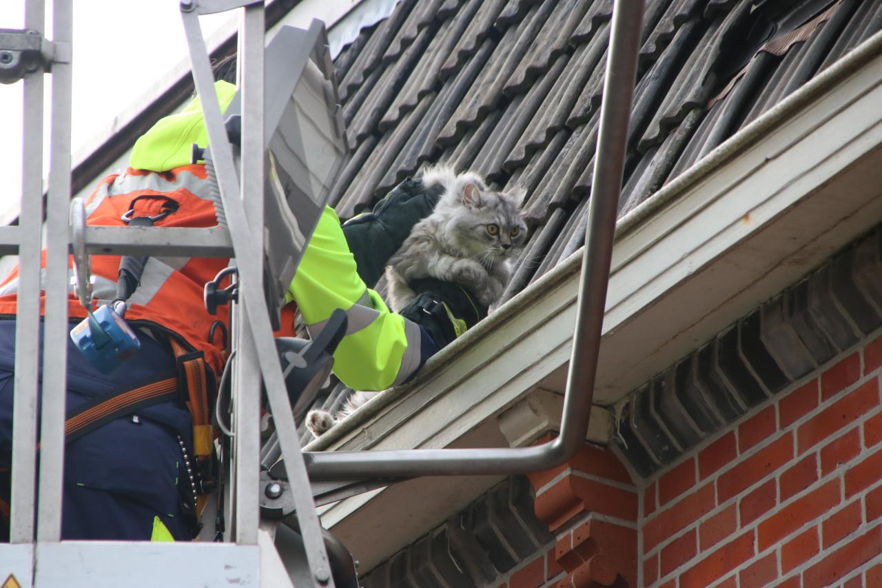 Brandweerlieden hebben met behulp van een hoogwerker het dier bevrijd. De kat is vervolgens gecontroleerd door de Dierenambulance. Of het diertje ook mee moest is onbekend.