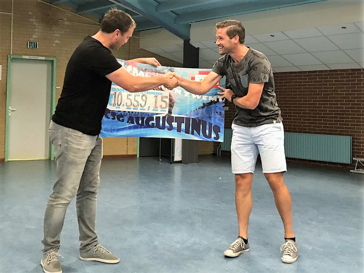 Foto: Emiel Miedema reikt de cheque uit aan Neal Haan van Swim Challenge Groningen