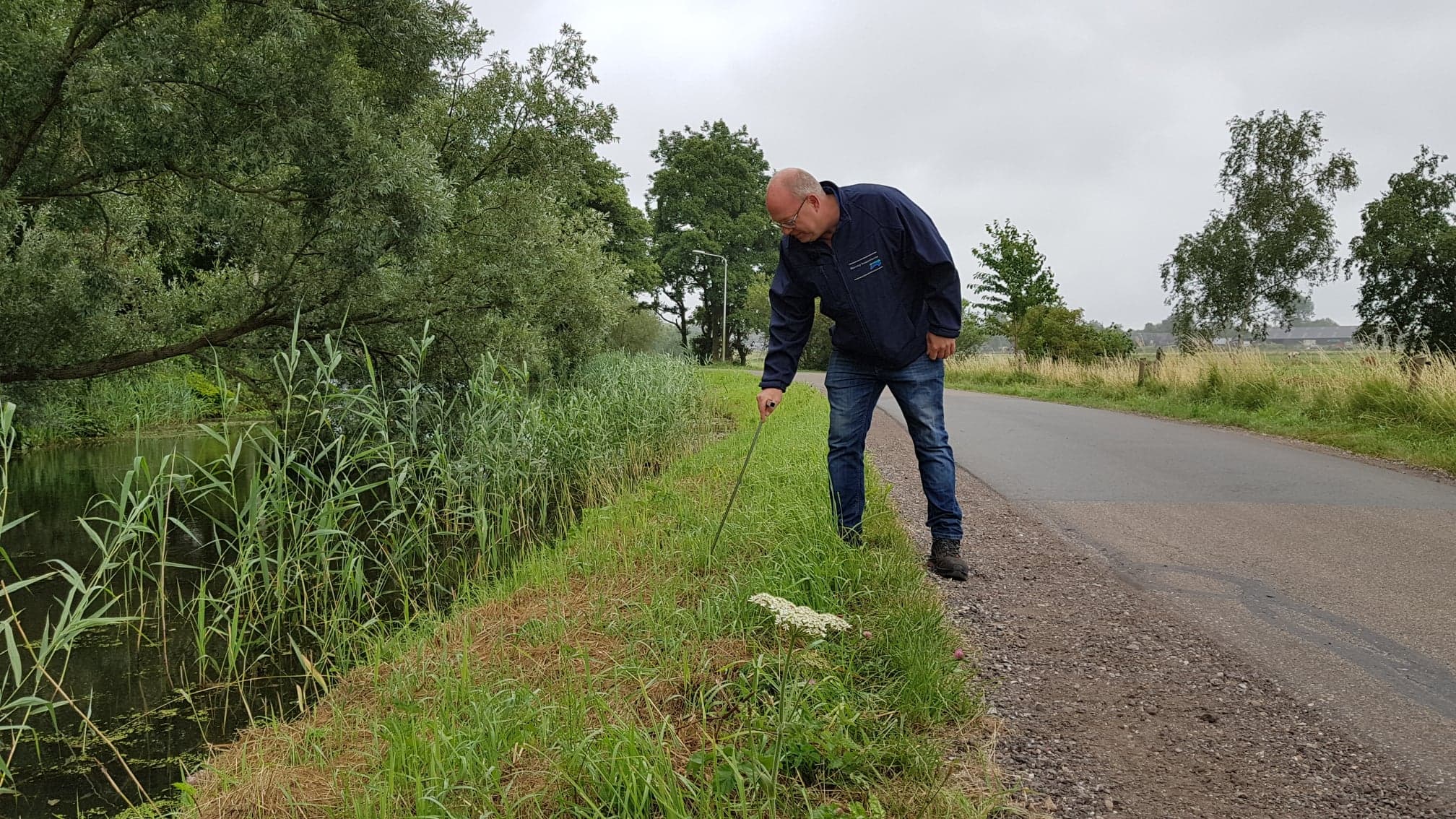 “Als ik denk dat er een zwakke plek in zit dan steek ik de prikstok erin om te controleren. Maar de dijk is goed, er is nog weinig aan de hand. De kwaliteit is goed en er zitten nog geen grote scheuren in”, vertelt Marc Nijhof, inspecteur van Noorderzijlvest. Hij loopt over de Hoornsedijk en steekt steekproefsgewijs de prikker in de grond.
