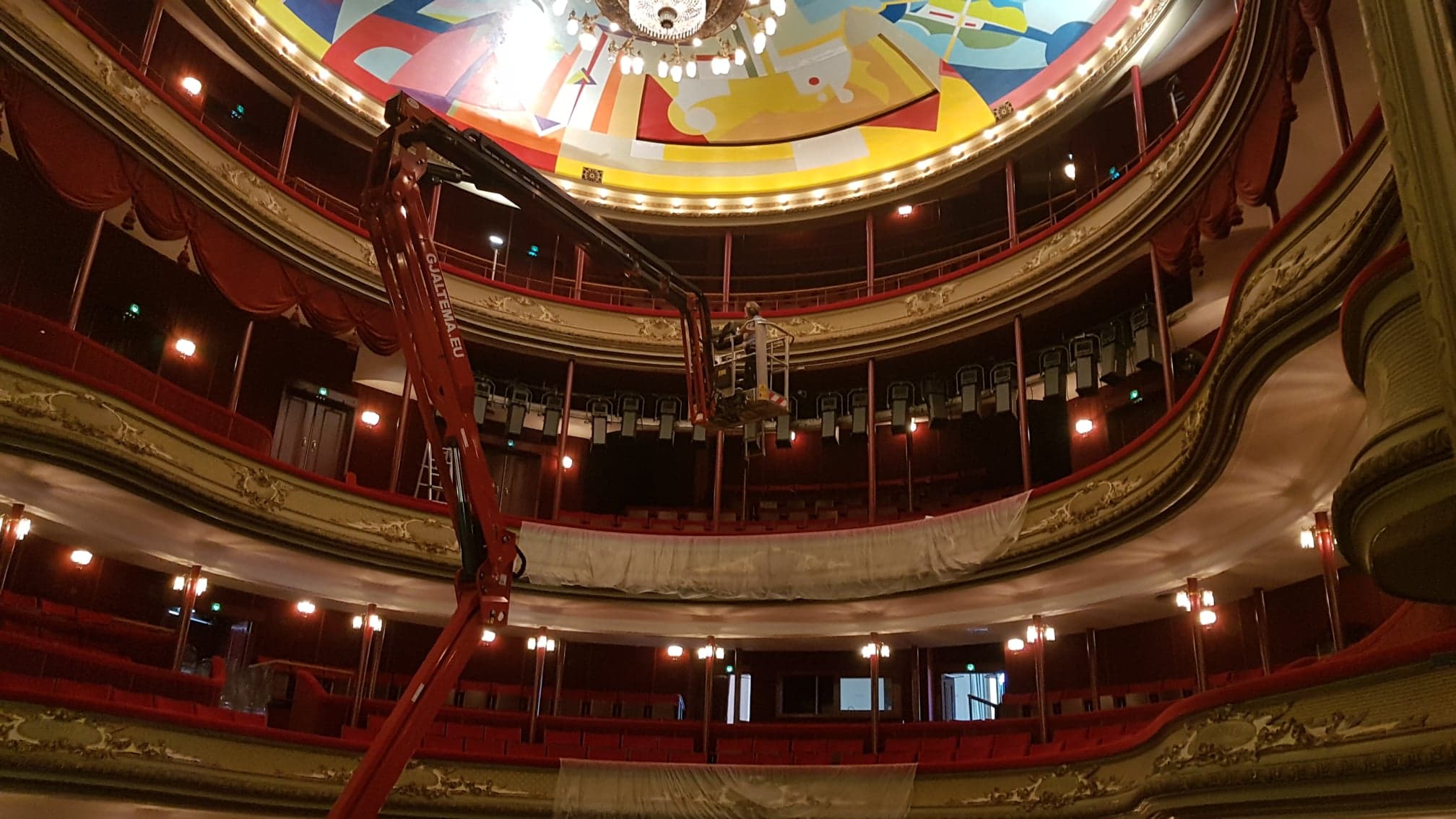 “Om binnen in een pand op zo’n hoogte te werken en ook nog zelf de hoogwerker te moeten bedienen is heel bijzonder”, vertelt Gielen vanuit het bakje van de hoogwerker helemaal bovenin de schouwburg.