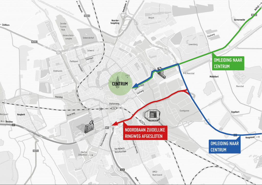 Vanaf vrijdag 6 juli 22.00 uur tot maandag 9 juli 6.00 uur is de noordbaan van de zuidelijke ringweg tussen het knooppunt Euvelgunne en het Julianaplein gestremd. Dan wordt de tijdelijke weg afgemaakt en aangesloten op de rest van de ring. De omleidingsroute is op de kaart hieronder te vinden.