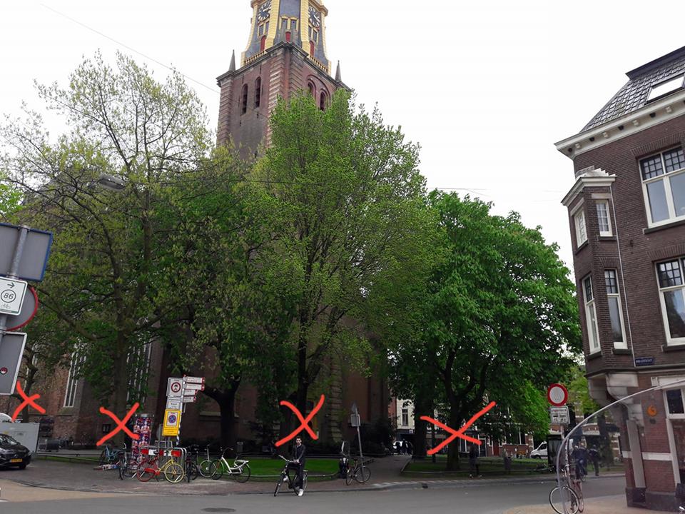 Van de prachtige schaduwplek met oude bomen op het A-Kerkhof wil de gemeente een strak ontworpen “verblijfsplek” maken met puntige granieten bakken met grassprieten en losse stoeltjes. In plaats van de rustige plek, sfeer, bomen en schaduw te koesteren, wordt er een nieuw hitte-eiland gecreëerd in deze tijd van klimaatopwarming’, melden de Bomenridders.