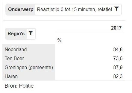 De gemeenten Haren en Ten Boer doen het volgens de cijfers van het Centraal Bureau voor de Statistiek iets minder. De politie is daar in respectievelijk 74 en 82 procent van de gevallen binnen 15 minuten aanwezig op de plaats van de oproep.
