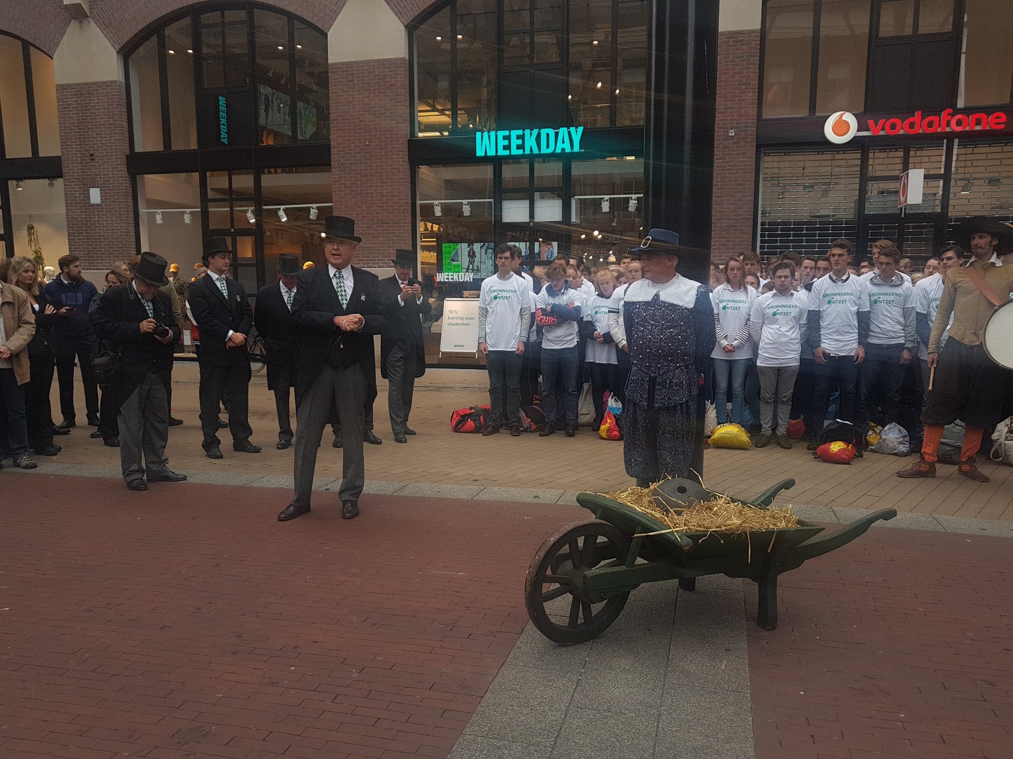 Bij de buste werd ook de bom uit 1672 gepresenteerd die onlangs werd opgegraven in de stad. Deze maakt dinsdag in een authentieke kruiwagen een tocht door de stad, begeleid door re-enactors en stadsarcheoloog Gert Kortekaas.