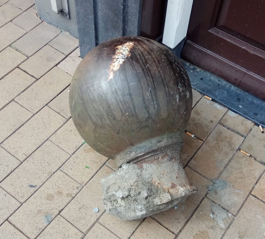 Komt niet van het dak, dan had er een grote deuk in de stoep gezeten. Dat is zo'n bol die de zelfde functie heeft als een Amsterdammertje. Meegenomen door studenten die hem toch maar te zwaar vonden. Waarschijnlijk is er een auto tegen gereden waardoor ie los kwam.