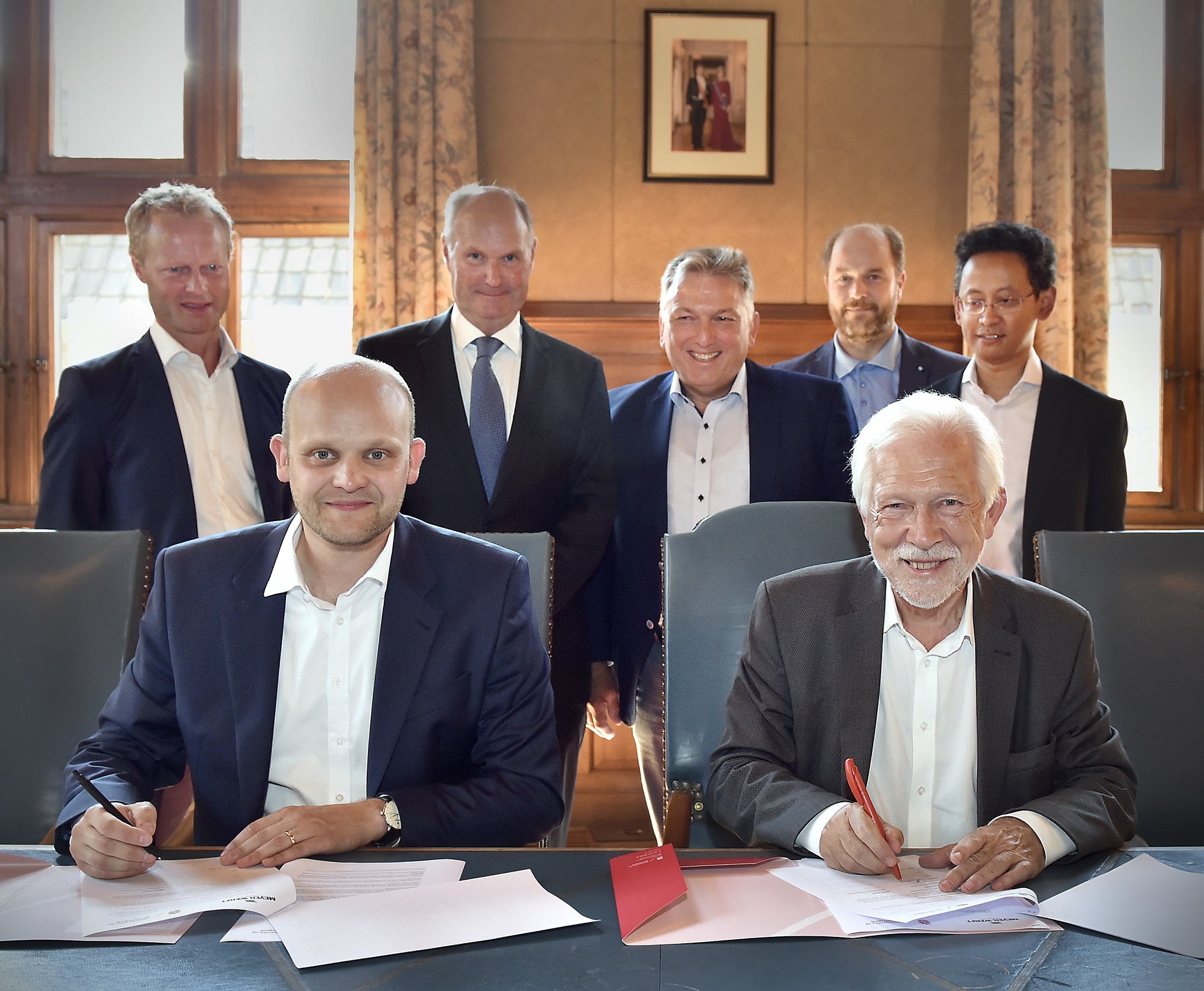 Burgemeester Peter den Oudsten heeft donderdag de Erepenning van de Stad Groningen uitgereikt aan bestuursvoorzitter Sibrand Poppema van de Rijksuniversiteit.