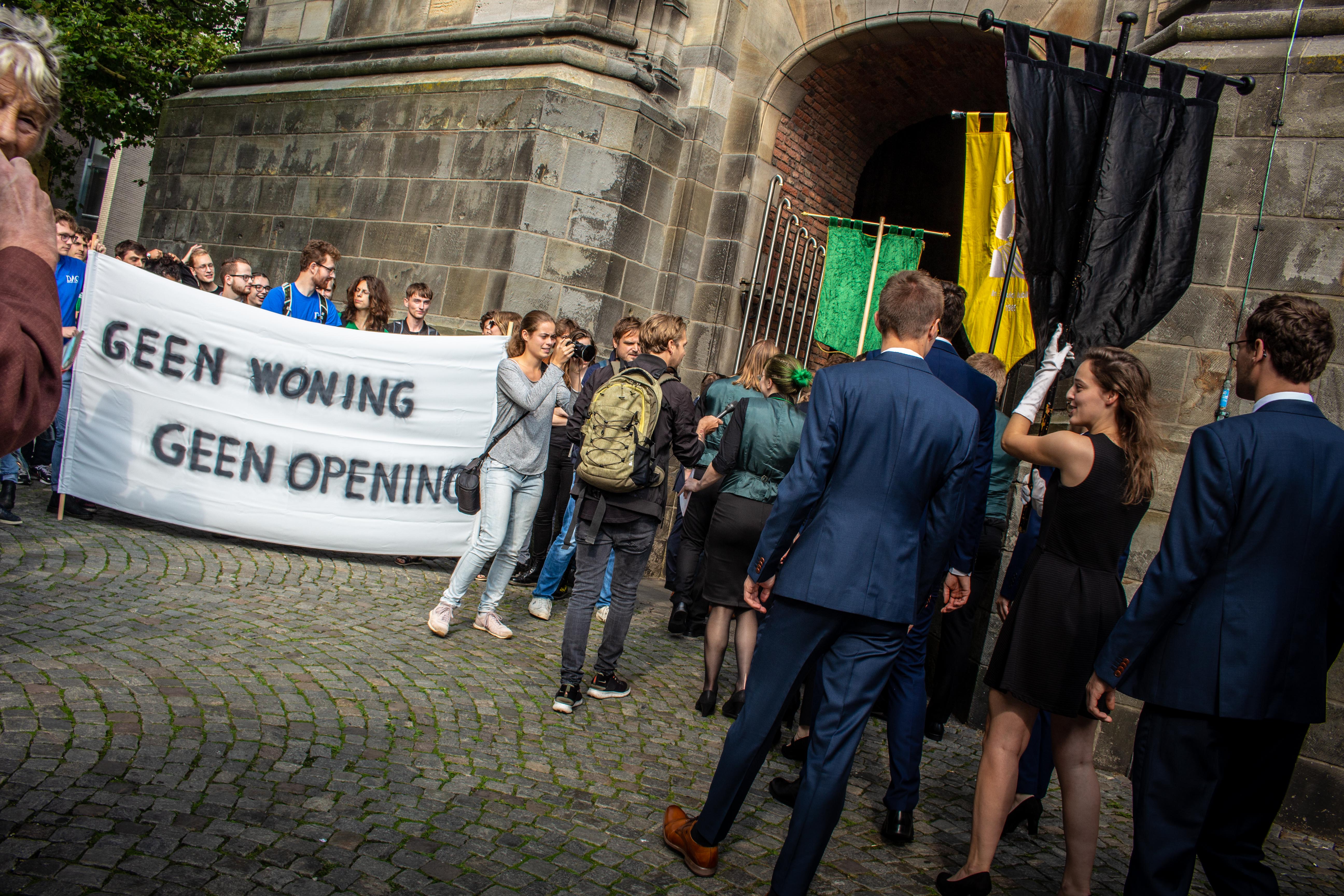 Diverse studenten en politieke jongerenorganisaties protesteerden bij de opening van het academisch jaar van de universiteit maandag bij de Martinikerk om aandacht te vragen voor de slechte huisvesting van buitenlandse studenten.