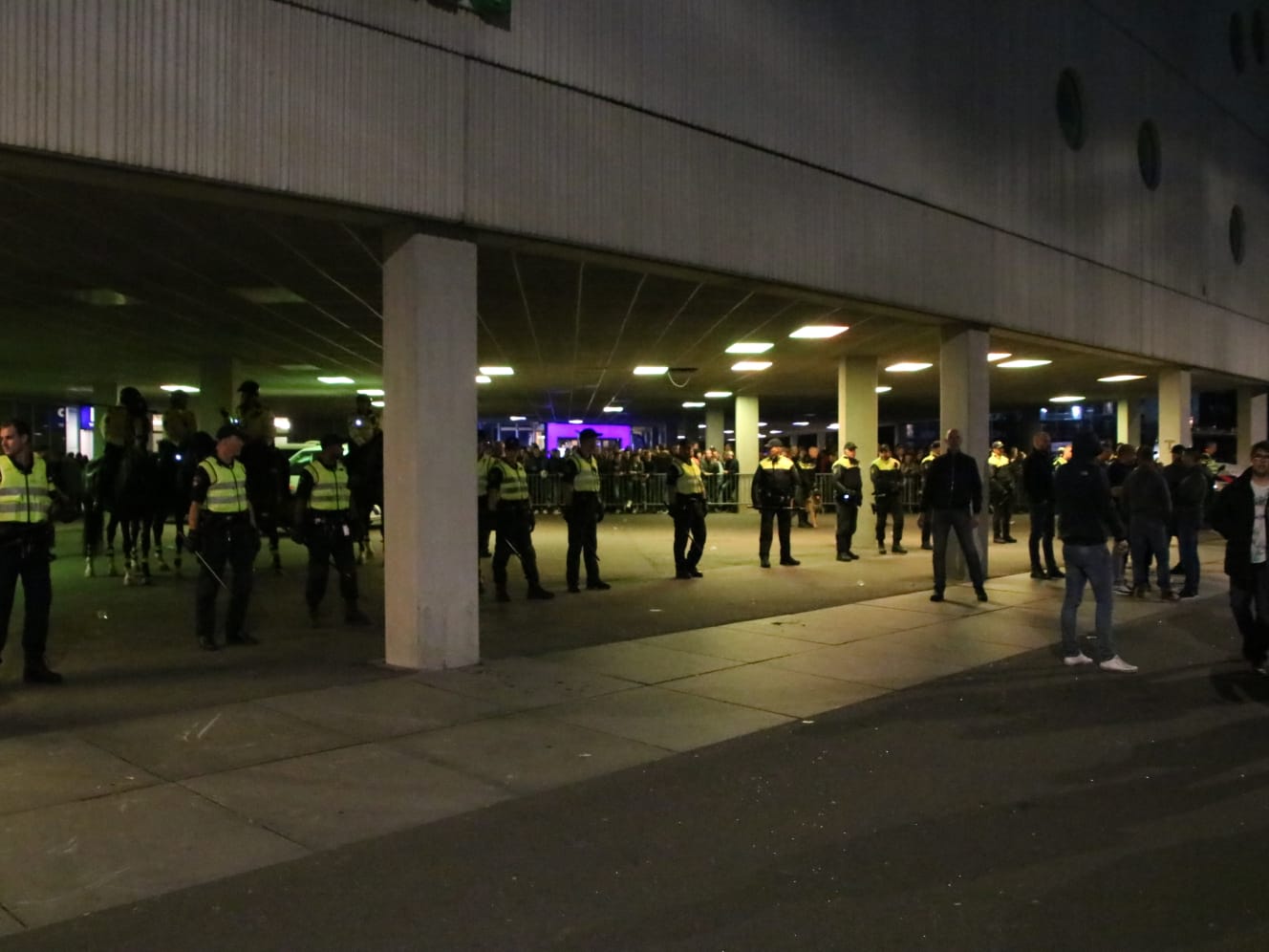De fans dreigden de hoofdingang van het stadion te bestormen. Daarop greep de politie in, onder meer met paarden. Een deel van de supporters kon daardoor een uur lang het stadion niet uit.