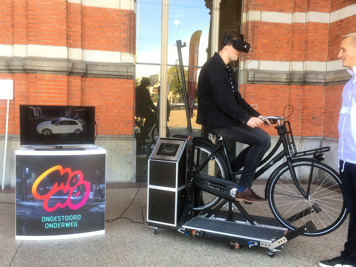 Op de fiets ervaren deelnemers met behulp van een 3D-bril in een Virtual Reality-wereld wat het effect is van afleiding op de fiets. Doordat ze het zelf ervaren, is de kans het grootst dat ze in het vervolg niet meer appen op de fiets of hun telefoon op stil zetten.