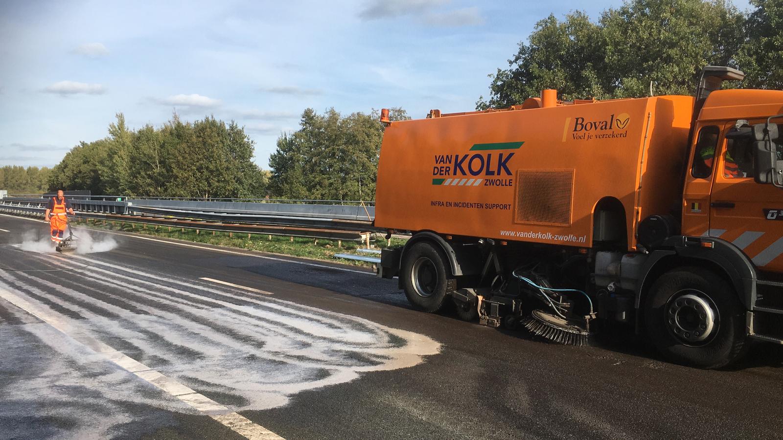 Inmiddels is de weg weer schoon en kan het verkeer weer doorrijden. Het wegvak was vanochtend bezaaid met sukerbieten na een ongeluk met twee vrachtwagens. Een van de vrachtwagens kwam door de vangrail op de andere weghelft terecht.