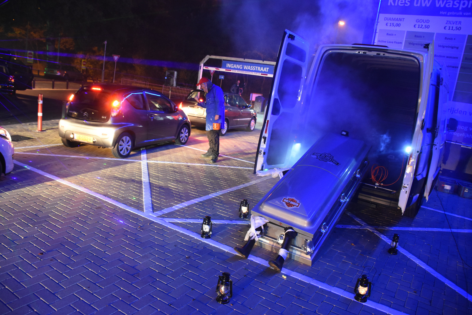 Het was woensdagavond Halloween. Dat werd op diverse plaatsen in de stad gevierd met griezeltochten. Maar je kon ook onder horroromstandigheden je auto laten wassen.