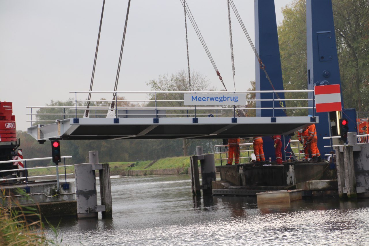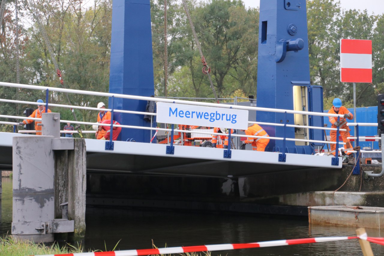 Onder grote belangstelling is vrijdagmiddag het brugdek van de Meerwegbrug in Haren teruggeplaatst. Voor de terugplaatsing werd groot materieel ingezet.