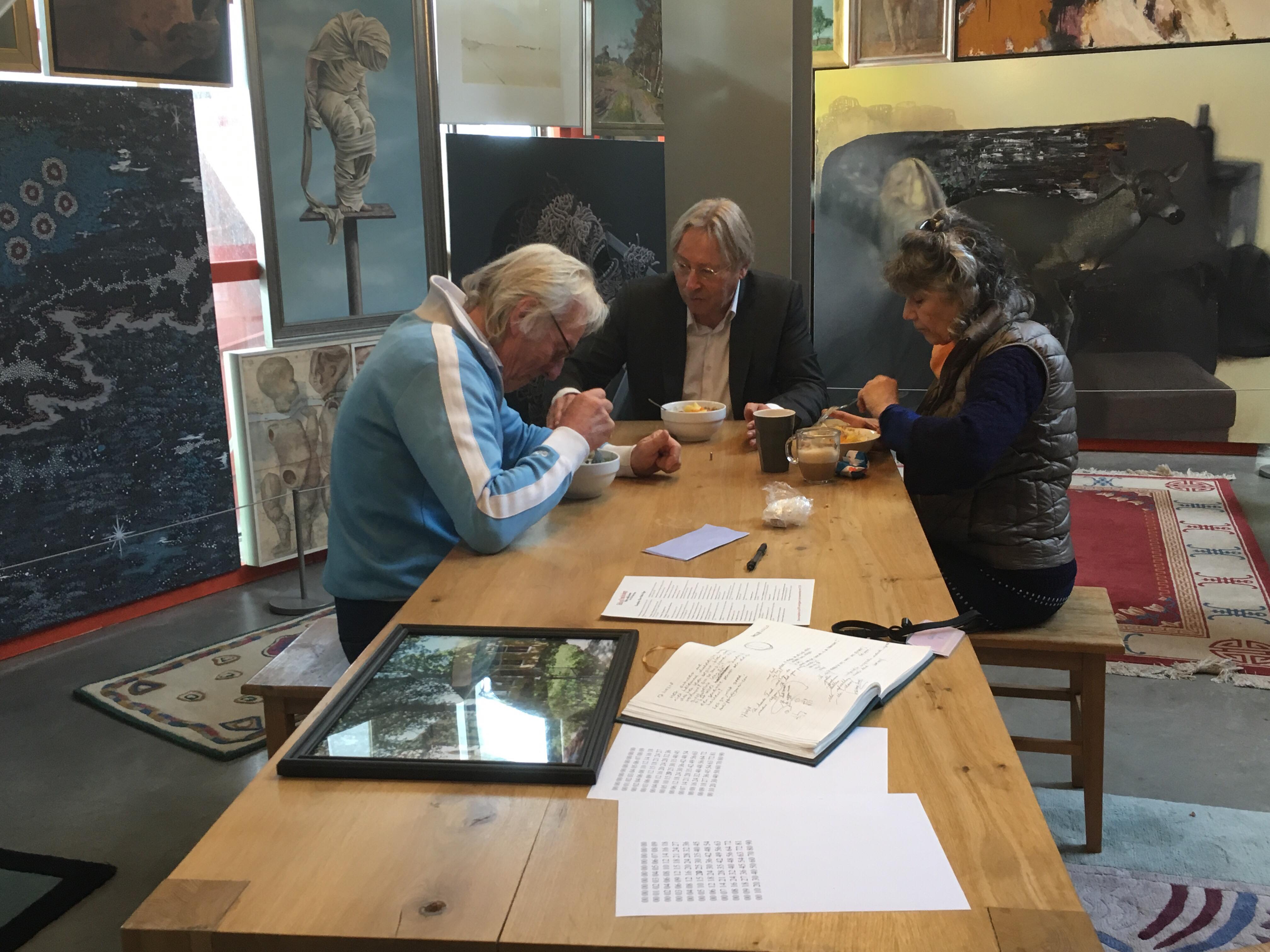 Burgemeester Peter den Oudsten ontbeet vanochtend bij Hella en Freek de Jonge in het Groninger Museum. Zij starten elke dag met een gezond ontbijt als onderdeel van hun tentoonstelling, waarbij ze een groot deel van de dag in het museum wonen.