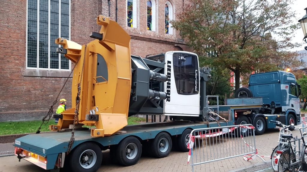 De kraan gaat gebruikt worden voor de bouw van een hotel op de Grote Markt. Om de torenkraan op te bouwen moesten verschillende onderdelen per dieplader aangevoerd worden. Voor de vrachtwagenchauffeur was het nog een hele uitdaging omdat hij vanaf het Martinikerkhof achteruit moest inrijden richting de bouwplaats.