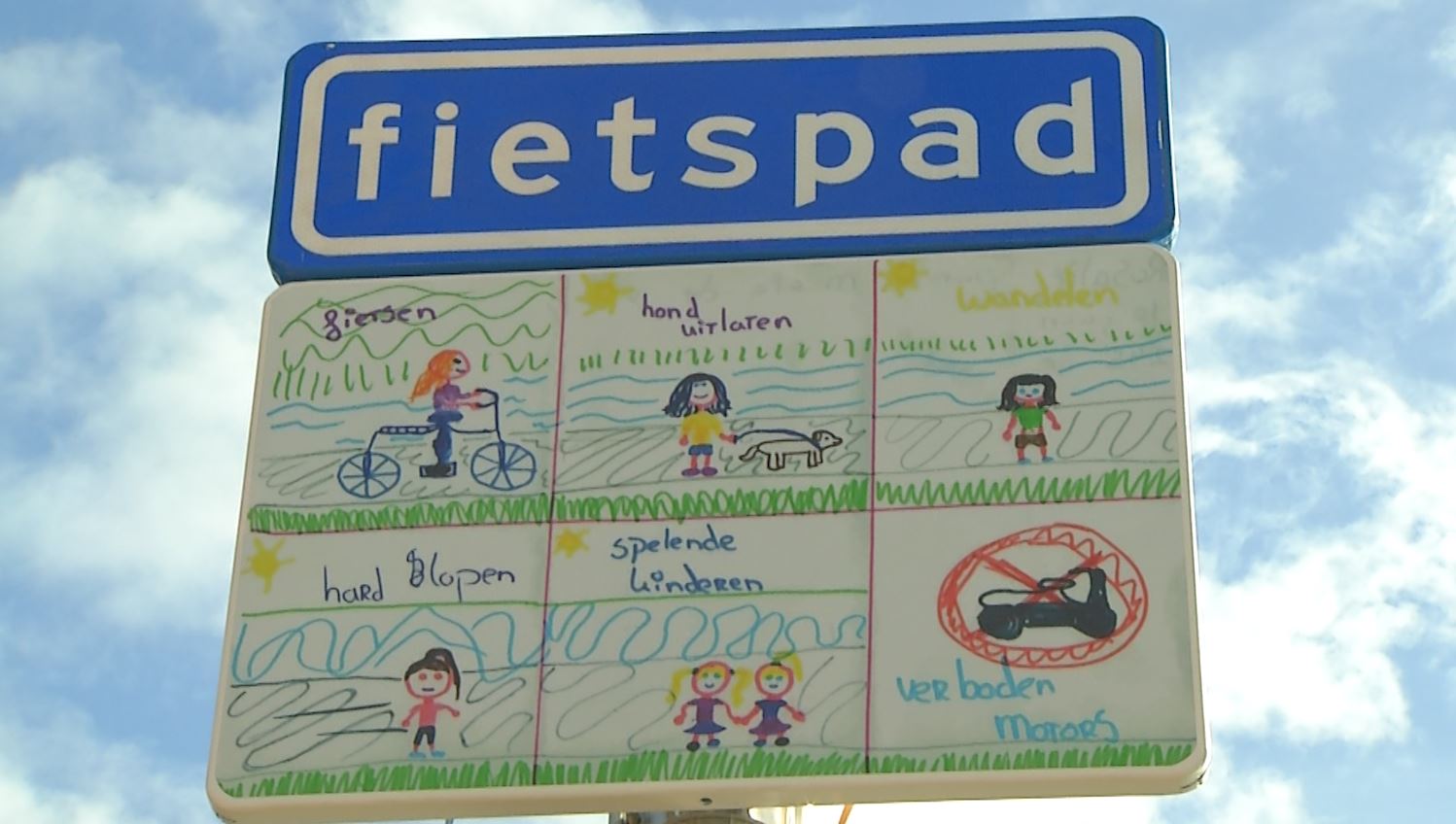 Volgens een jury ontwierp Rosalie het mooiste verkeersbord. “Ik heb zes pictogrammen gemaakt die eigenlijk vertellen wat je hier wel en niet mag”, vertelt ze terwijl ze naar haar bord wijst. “Dat het bord hier nu hangt maakt mij wel trots. Als ik hier over tien jaar langsloop kan ik zeggen dat dit gewoon mijn bord is.”