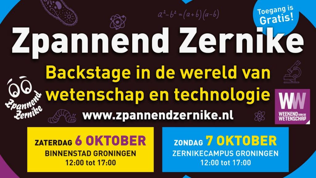 Dat wordt in Groningen groots gevierd met Zpannend Zernike, waarbij twee dagen lang volop activiteiten worden georganiseerd op het gebied van wetenschap, natuur en de mens. Op zaterdag is er van alles te doen op zes locaties in de binnenstad, waarna het programma zich op zondag verplaatst naar de Zernike Campus. Het evenement is vooral gericht op kinderen, maar ook voor volwassenen zijn er veel interessante lezingen en activiteiten. Je kunt bijvoorbeeld meedoen aan een wetenschapsquiz, het DNA uit een banaan halen of waterraketten lanceren met André Kuipers.