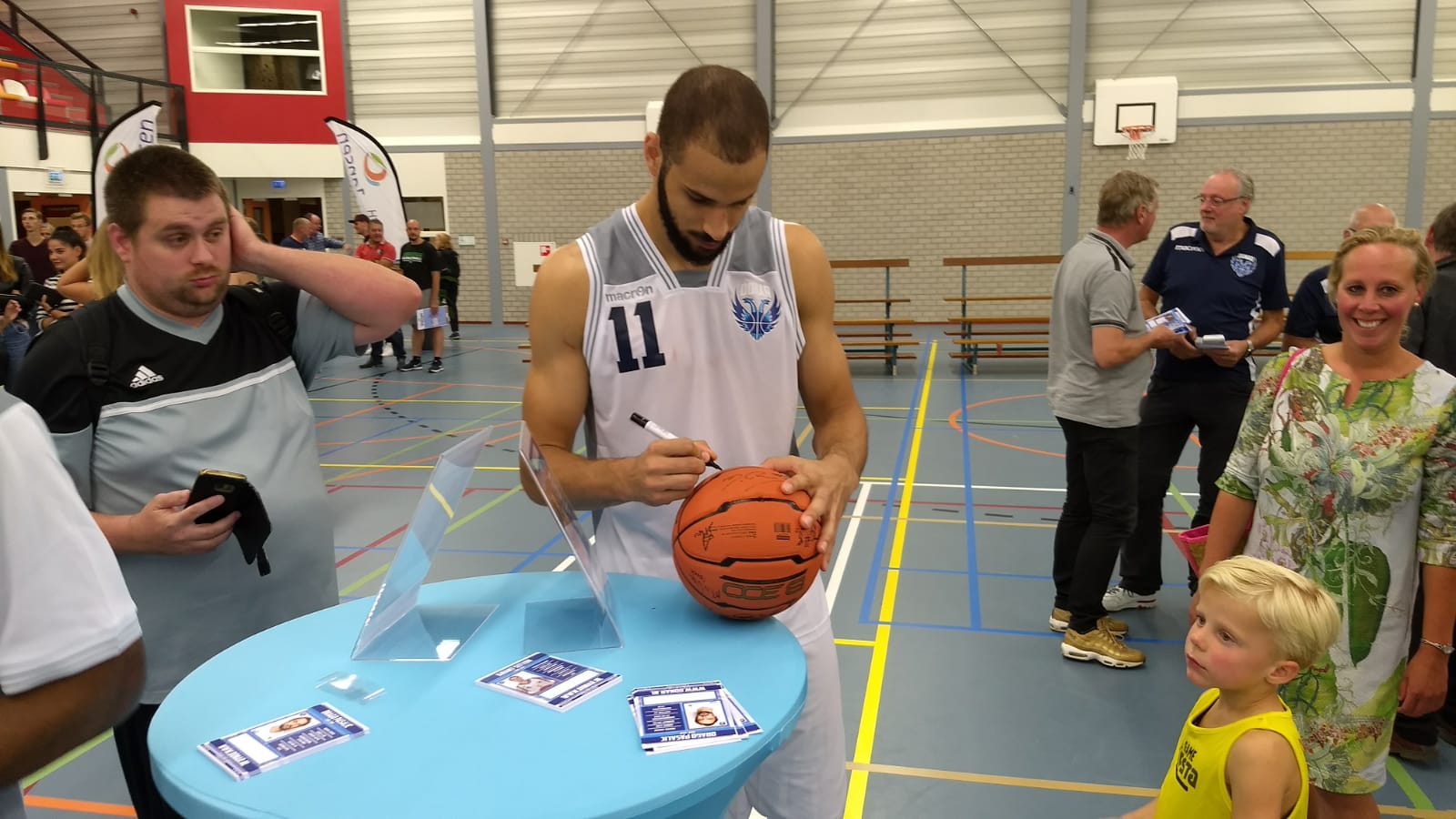 Foto Wessel Aslander. Shane Hammink van Donar signeert na afloop een basketbal.