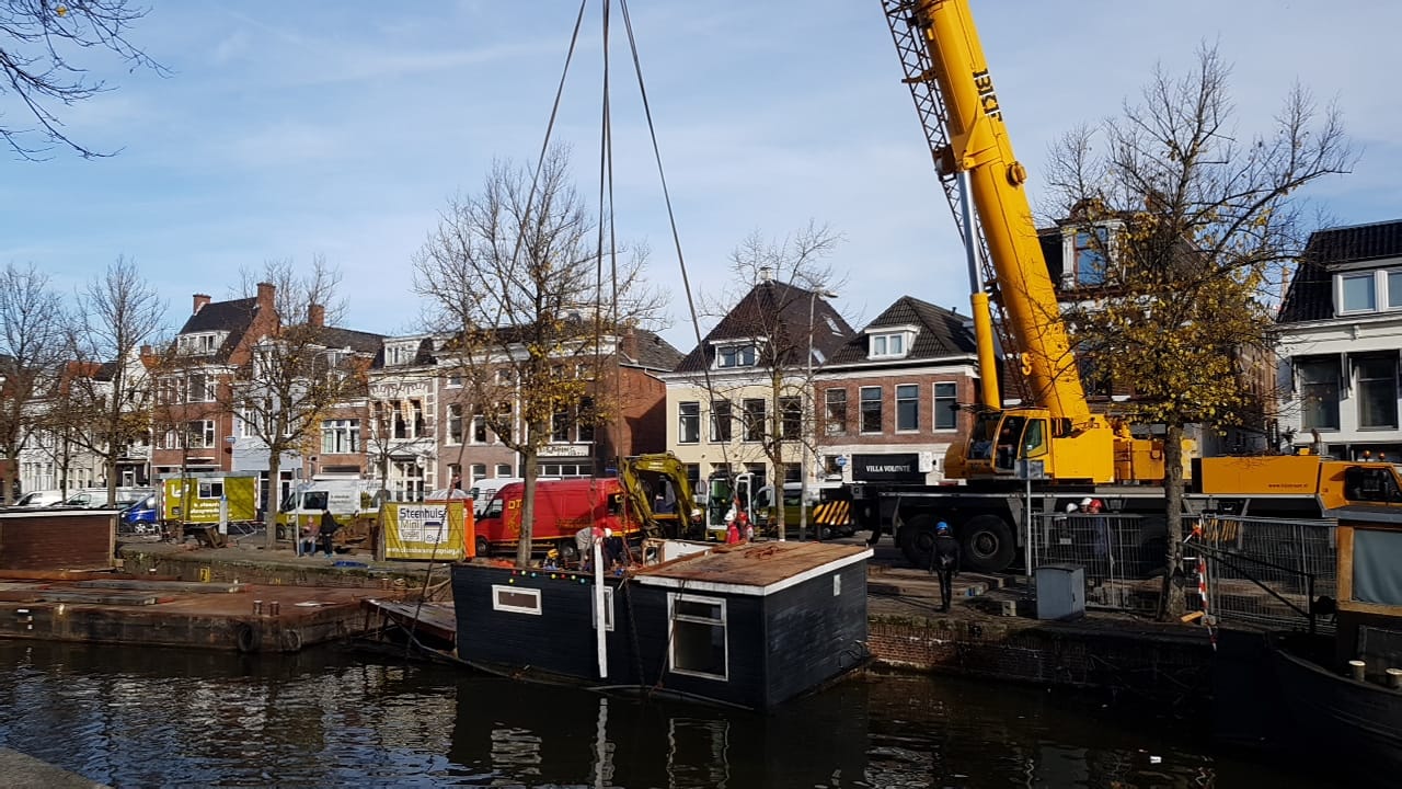 De woonboot die vorige week is gezonken is dinsdag uit het water van het Schuitendiep getakeld.