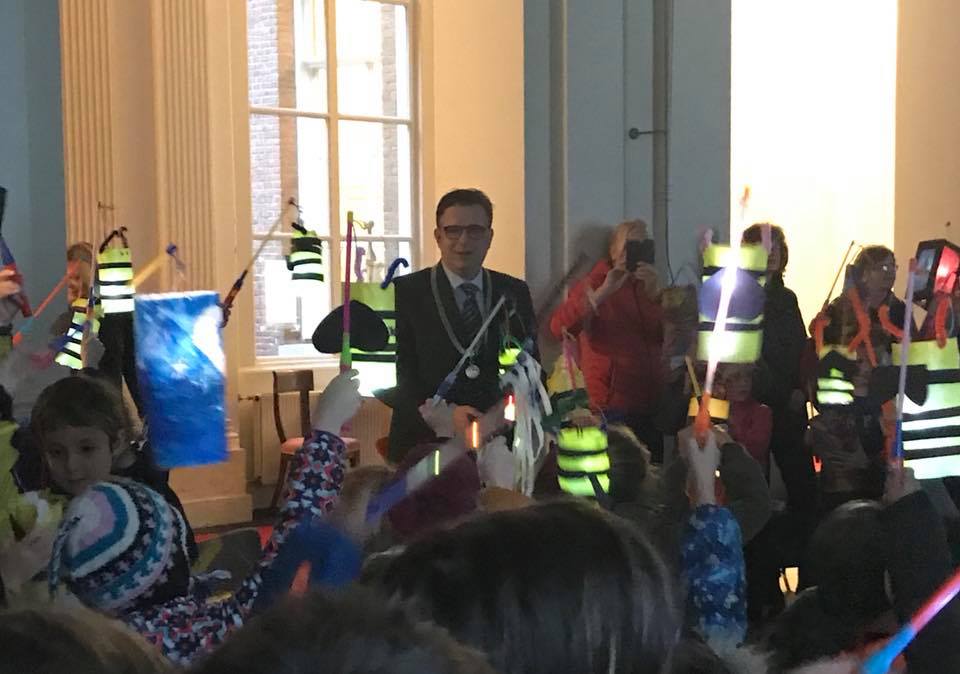 “Het is een goede traditie dat op het Stadhuis enkele klassen van de nabijgelegen Borgmanschool liedjes komen zingen op Sint Maarten”, vertelt Van der Schaaf. “Dit jaar kwamen maar liefst honderd kinderen langs die ons mooi toe hebben gezongen. Ondertussen konden wij genieten van hun lampionnen, die er erg fraai uit zagen.” En zoals het zich betaamt op de naamdag van Martinus van Tours gingen de kinderen ook niet met lege handen naar buiten. “Iedereen heeft een mandarijn gekregen. We zijn tenslotte een Healthy Ageing stad.”