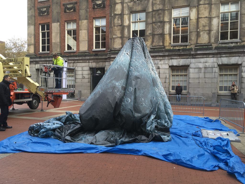 De kunstmaan die deze dagen het Waagplein siert, ziet er momenteel uit als een plumpudding.
