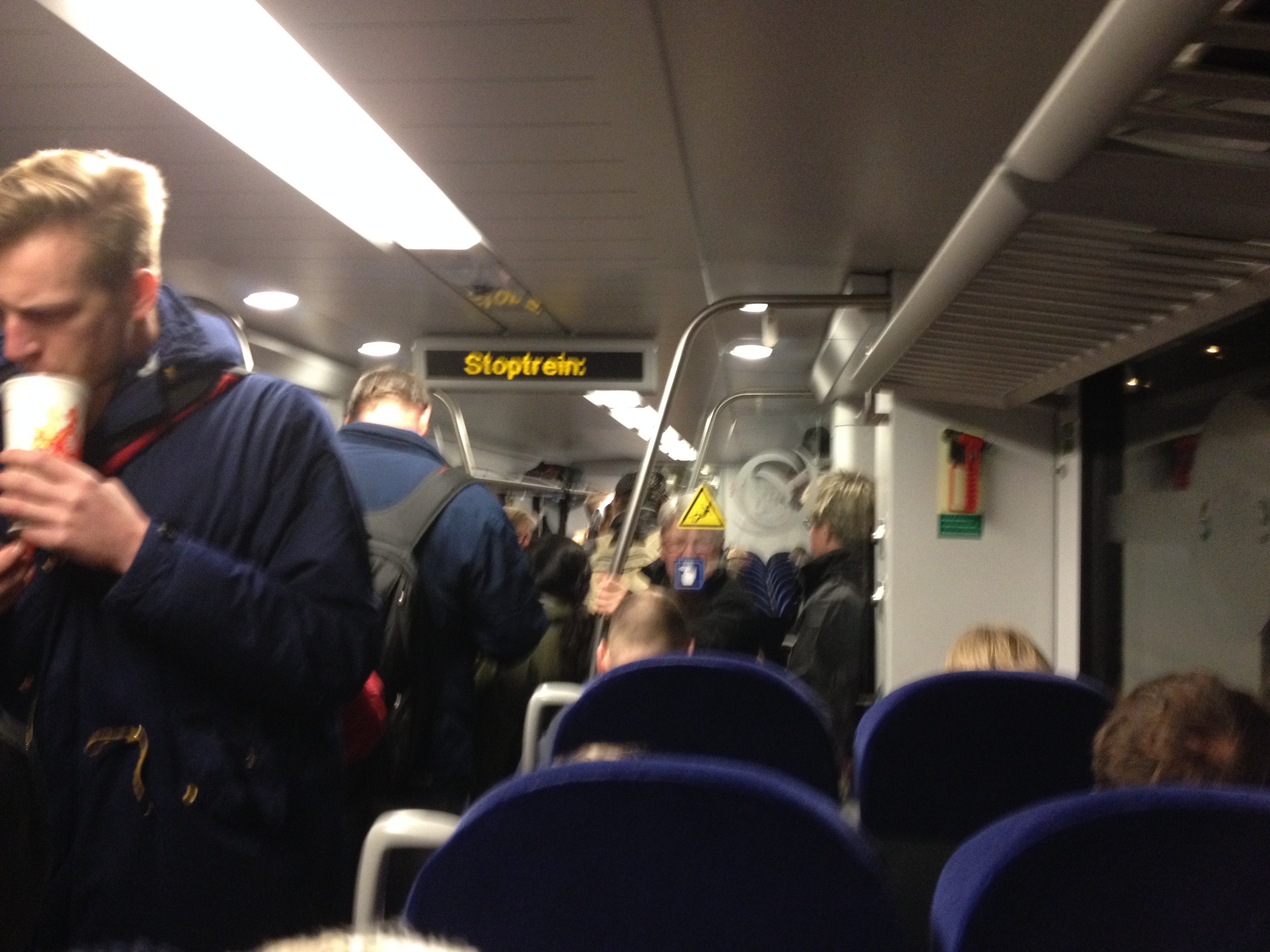 “Dames en heren”, klinkt de stem van de machinist via de intercom in de trein. “We hebben te maken met een sein- en wisselstoring. Zojuist heb ik een aanwijzing van de treindienstleider gekregen dat ik het rode sein mag passeren, wat betekent dat we kunnen vertrekken. Een goede reis!” Kort daarop zet de trein zich in beweging. Niet veel later gevolgd door flink wat lawaai van de typhoon, de toeter van de trein. De tijdelijke spoorwegovergang laat het volledig afweten en door te toeteren probeert de machinist de aandacht te trekken van de fietsers. Stapvoets wordt de overweg gepasseerd. “Kijk nu gaan de slagbomen pas naar beneden”, zegt een man tegen degene die naast hem zit als een groot deel van de trein de overweg al voorbij is.