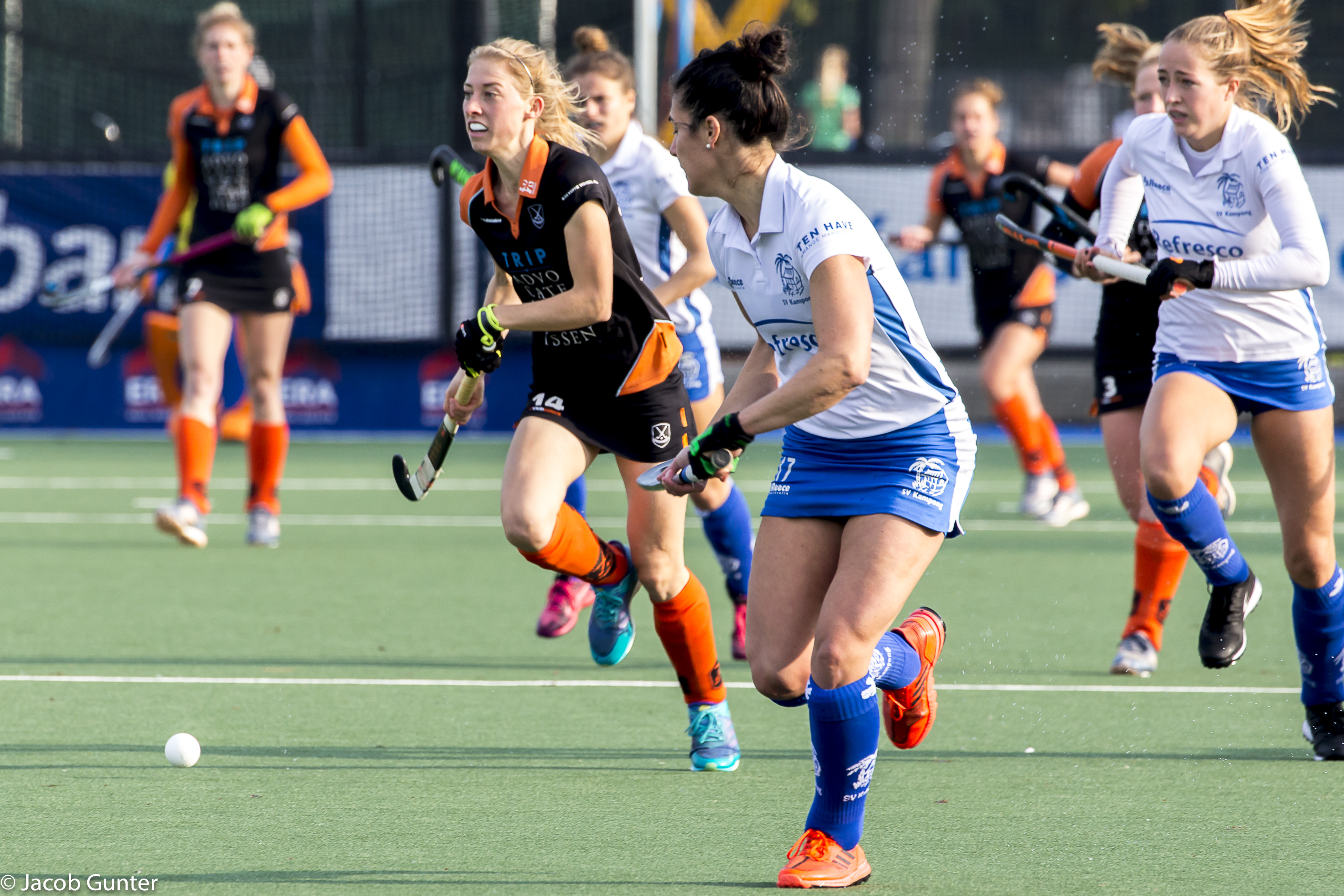 Fkeke Hoff wordt belaagd door Kampong-speelsters. Foto: Jacob Gunter