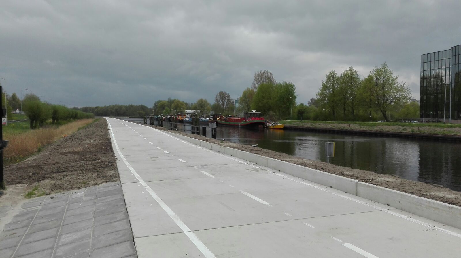 Best gevaarlijk met zo'n opstaand betonrandje. Ik zie al voor me dat er een snel biker in het water fietst. Komt er misschien nog een veilige afscherming? Dat zou wel verstandig zijn.