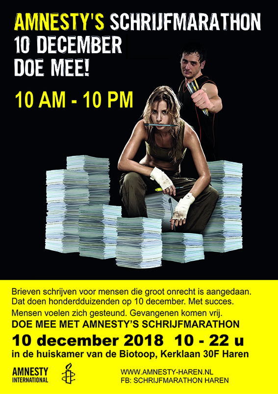 10 December is de Dag van de Rechten van de Mens. Op deze dag klimmen wereldwijd honderdduizenden mensen in de pen. De schrijfactie van Amnesty vindt ook plaats in de Biotoop, Vleugel F, Kerklaan 30, Haren. Van 10 uur ’s ochtends tot 10 uur ‘s avonds.