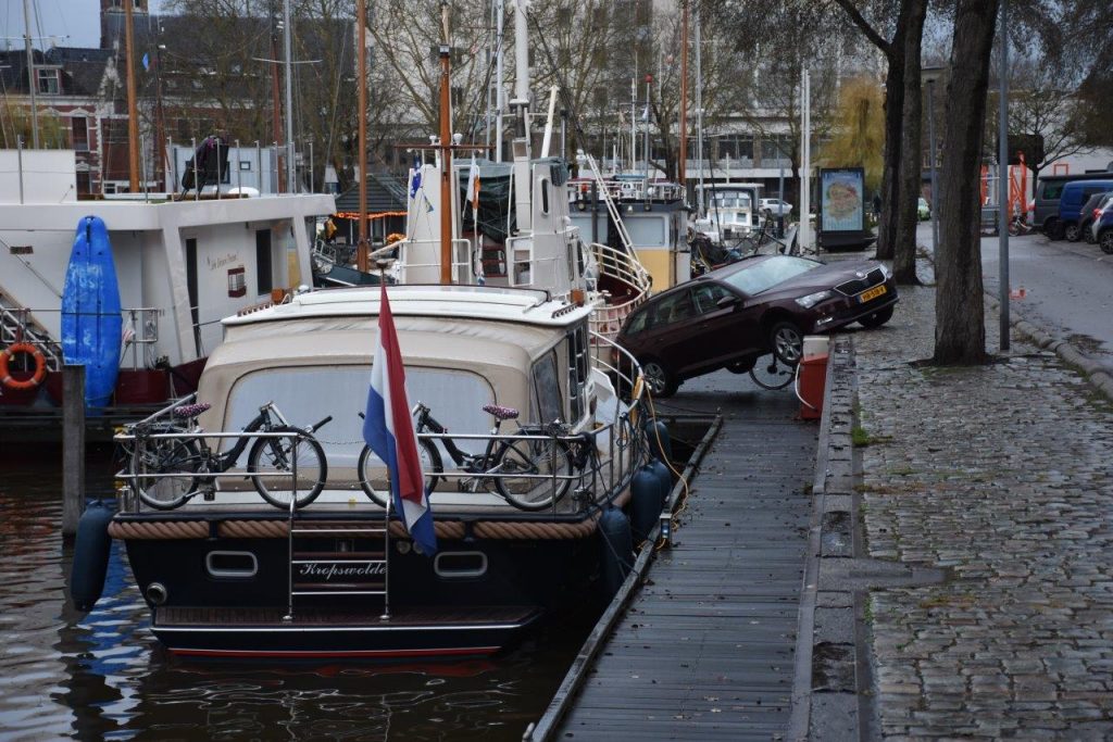 De bestuurder van de auto had zijn auto geparkeerd maar de handrem vergeten. Toen de eigenaar een parkeerkaartje ging halen hoorde hij een knal, eenmaal terug bij de parkeerplek lag de auto tussen wal en schip. De schade aan de boot en de auto lijkt mee te vallen.