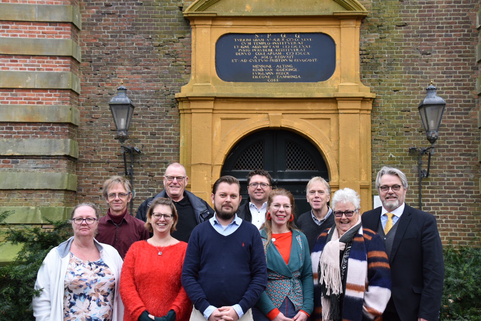 Met zijn allen voor de kerk. Waar zijn trouwens die bomen gebleven? Al gekapt?