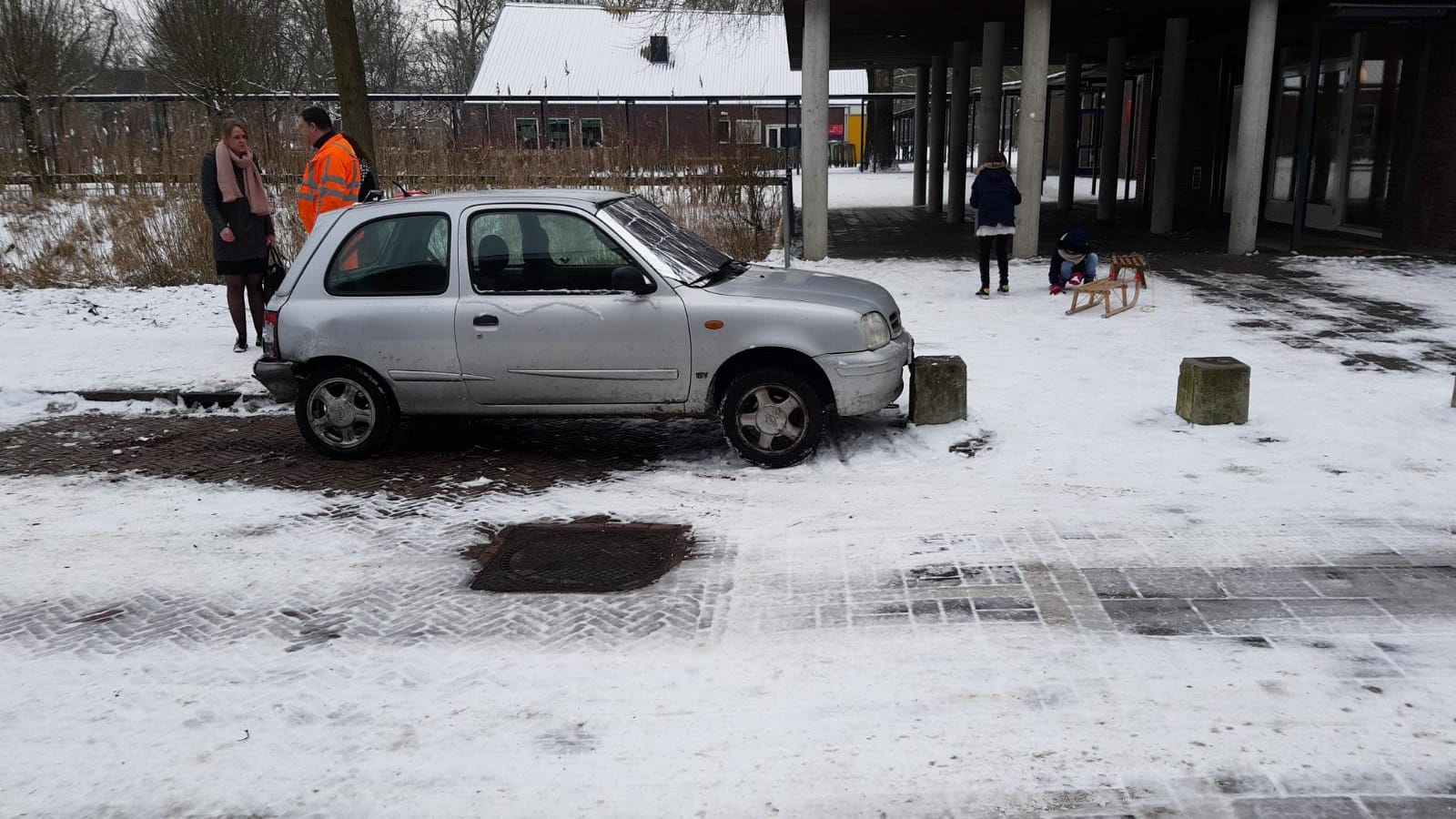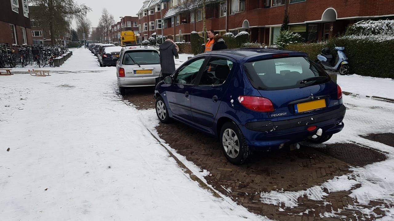 Het ongeluk gebeurde even na de klok van 15.00 uur. Waarschijnlijk als gevolg van de gladheid botste een blauwe personenauto op een grijze auto die geparkeerd stond. Door de klap schoof de grijze wagen door en kwam tegen een betonnen blok tot stilstand. Niemand raakte gewond. Wel raakten beide voertuigen dusdanig beschadigd dat ze weggesleept moesten worden door een bergingsbedrijf.