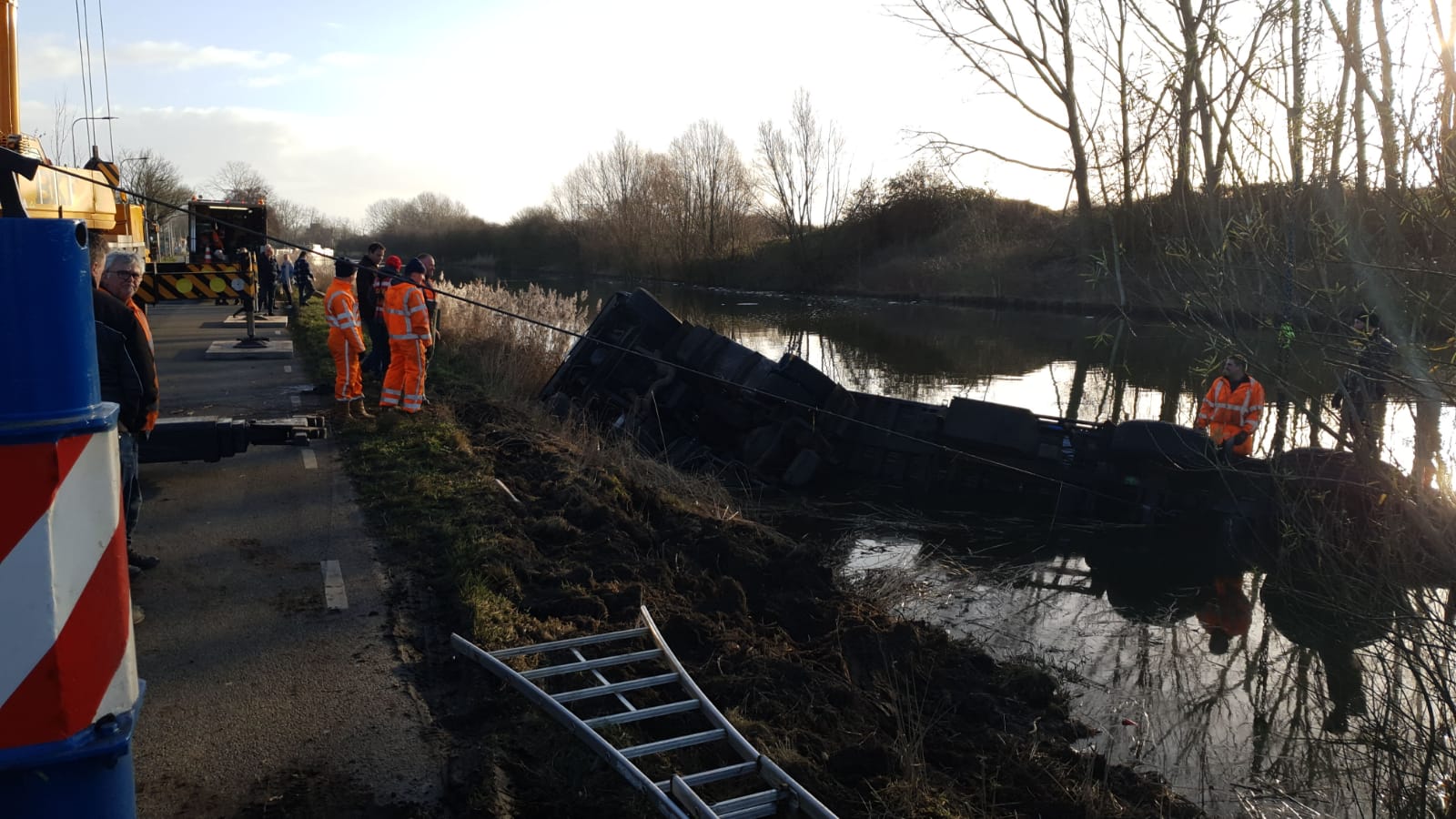 Volgens het betrokken bedrijf was de chauffeur niet aan het bellen, en was hij ook niet in slaap gevallen. De vrachtwagen wordt in de loop van woensdag uit het water gehaald.
