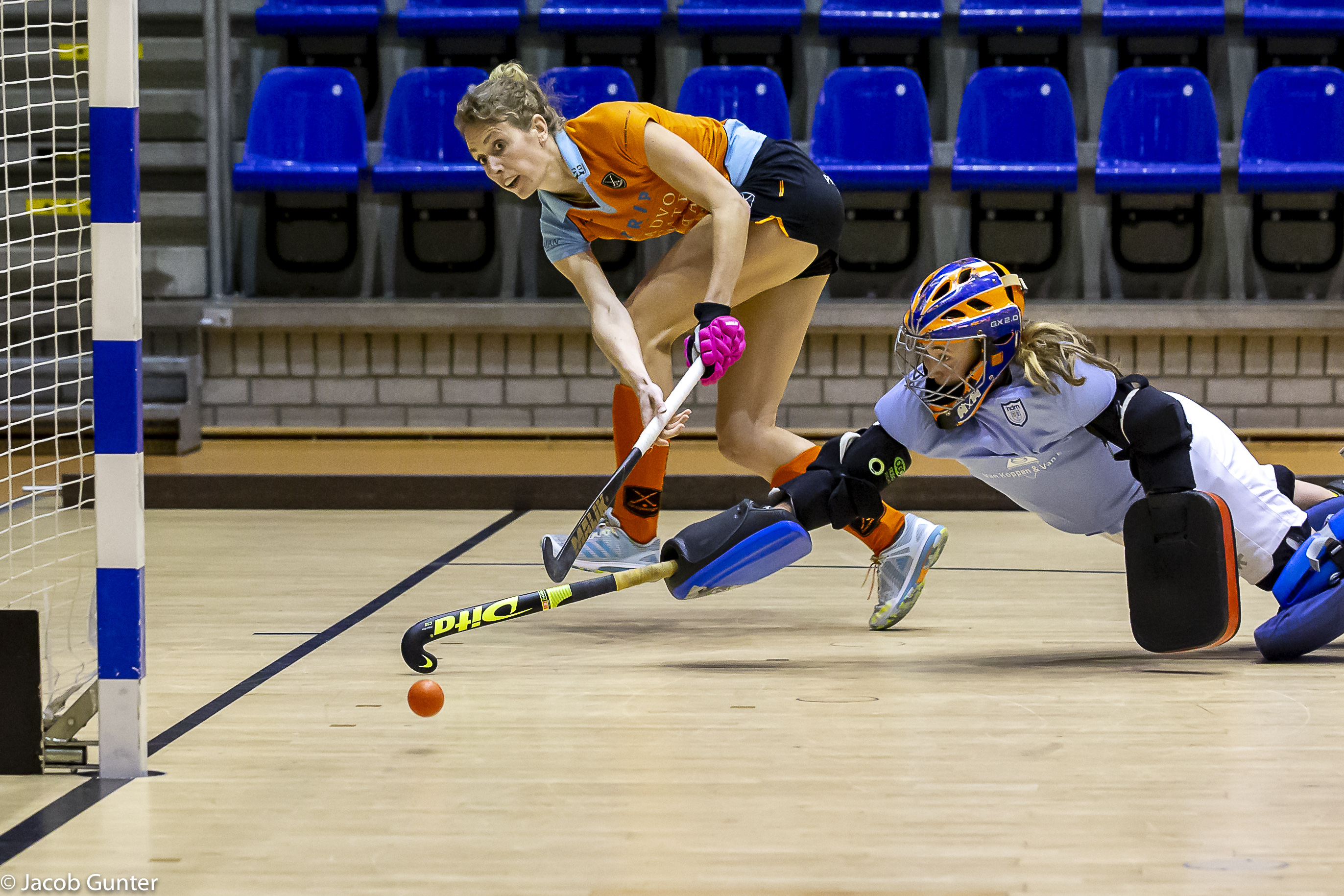Foto Jacob Gunter. Willemijn Kuis-Bos omspeelt de keeper van HDM en scoort de 1-0