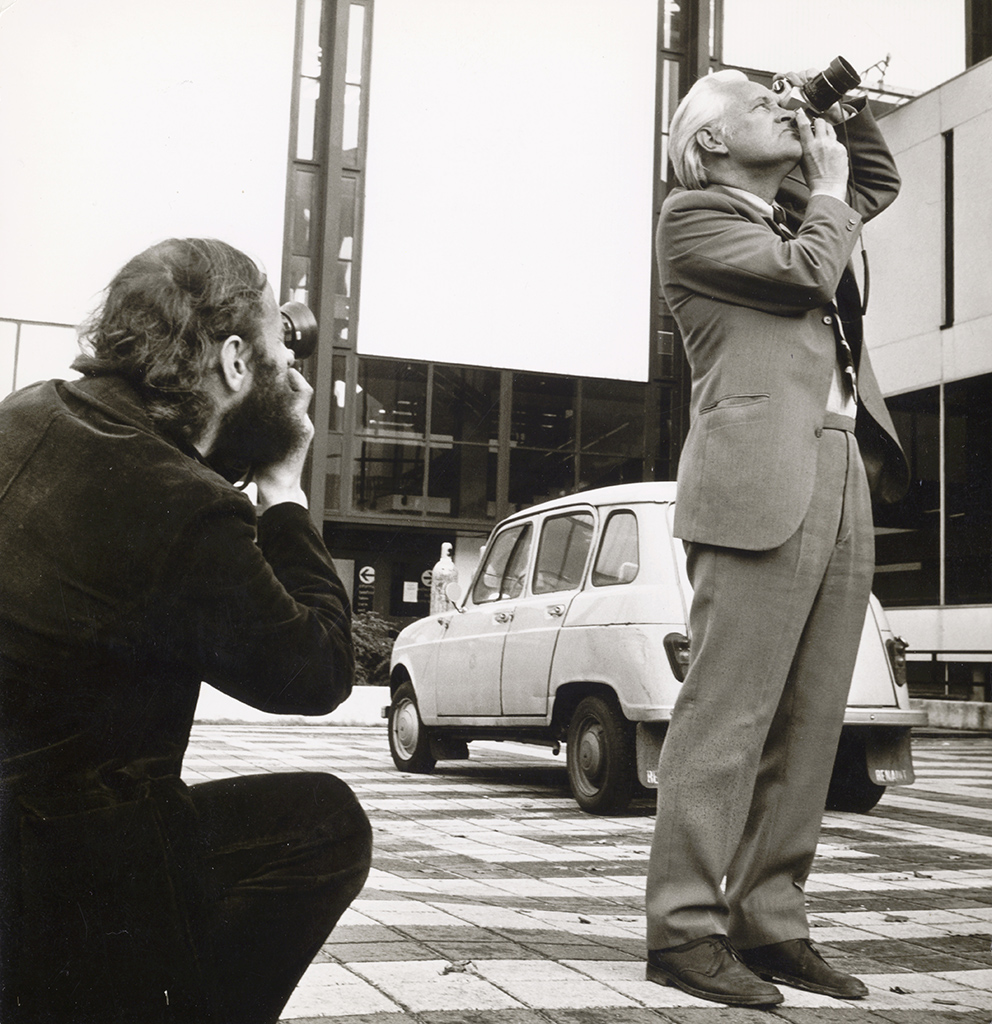 Op de foto: Fotografen Frank Straatemeier (l) en Dirk van der Veen (r) op het binnenplein van de Martinihal, 1976. Persfotobureau D. van der Veen, Groninger Archieven