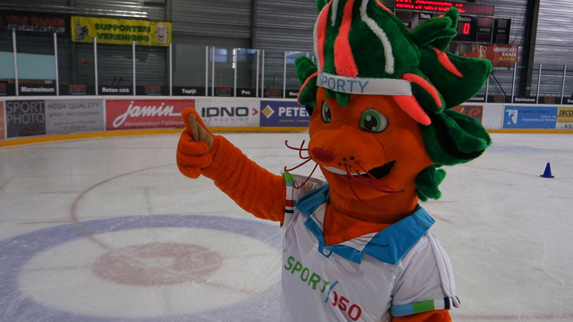 De mascotte van Sport050 ‘Sporty’ werkte vanmorgen in Sportcentrum Kardinge nog even de laatste training af in aanloop naar het NK Mascotteschaatsen.