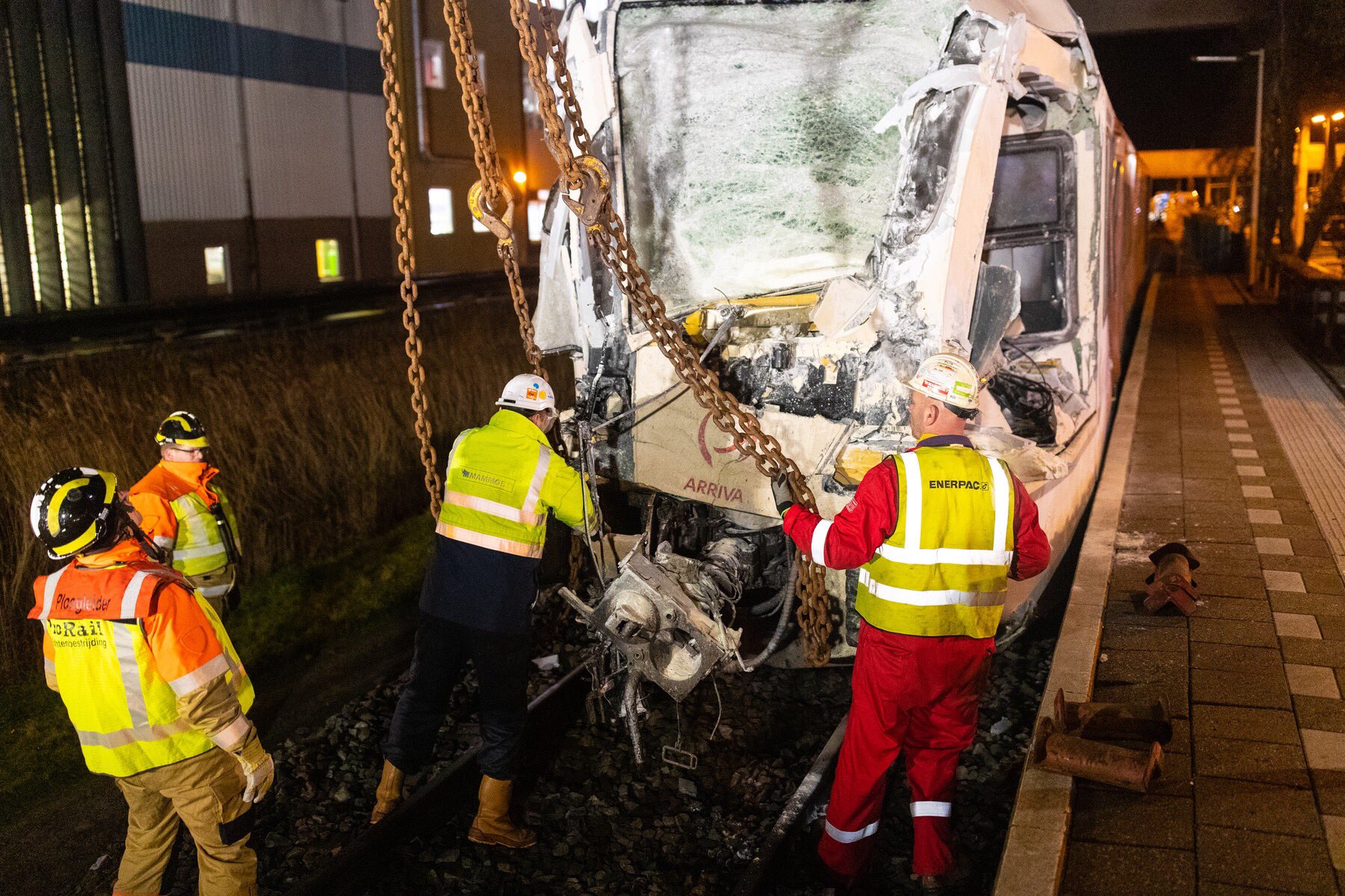 Terwijl de nacht al was aangebroken werd het eerste onderzoek afgerond en konden de incidentbestrijders bezig met een plan van aanpak hoe de trein geborgen kon worden. “Dit was extra lastig want de trein stond ontspoord tegen het perron aan waardoor er dus nauwelijks werkruimte voor ons was. Om die reden hebben we een grote kraan van het bedrijf Mammoet ingehuurd. Na het bevestigen van kettingen hebben we rond 01.30 uur de trein een klein beetje omhoog kunnen tillen waardoor we deze weer in de rails konden zetten. Daarna kon de trein weggesleept worden en konden we zien hoe groot de schade aan het spoor is.”