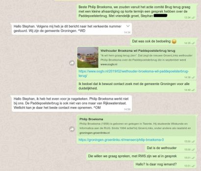 Tegen dit probleem is het actiecomité ‘Brug terug’ aangelopen. Het comité dat strijdt voor de terugkomst van de Paddepoelsterbrug wil graag om tafel met de vorige week geïnstalleerde wethouder Philip Broeksma (GroenLinks). Om contact met hem te krijgen besloot het comité om een appje te sturen naar de gemeente. Op het verzoek aan meneer Broeksma reageerde de gemeente met de woorden: “Volgens mij heb je dit bericht naar het verkeerde nummer gestuurd, wij zijn van de gemeente Groningen.”