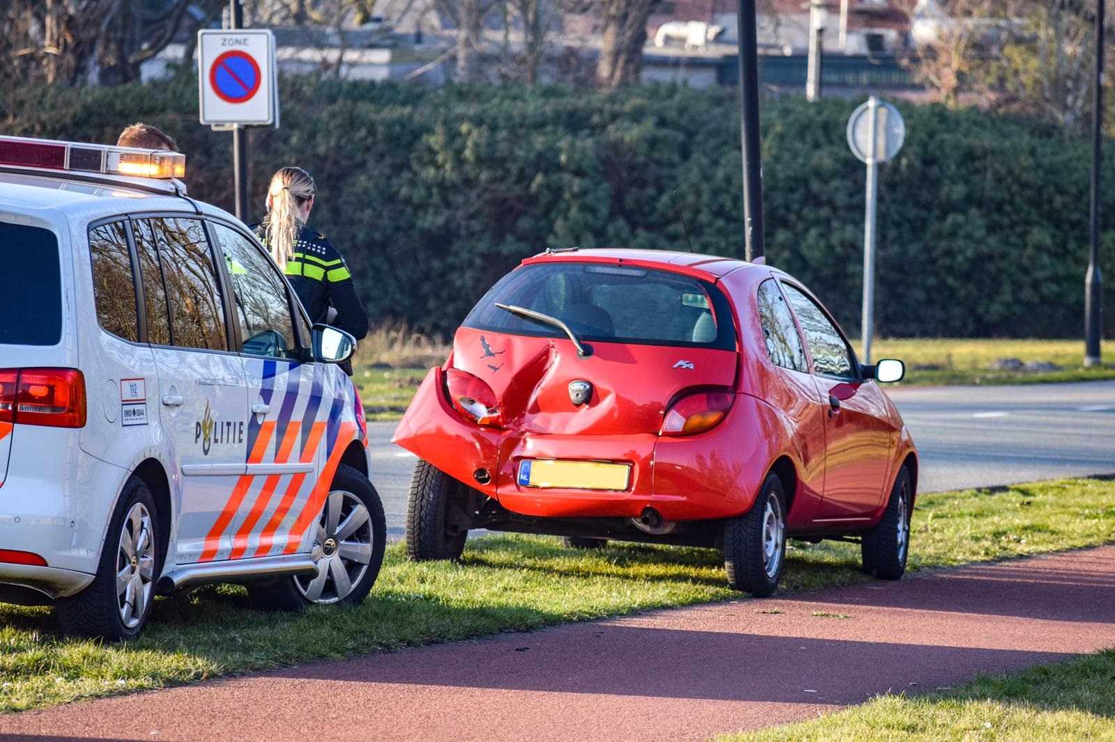 De rode personenauto raakte bij het ongeluk flink beschadigd. Een bergingsbedrijf heeft het voertuig weggesleept. De politie doet onderzoek naar de precieze toedracht.
