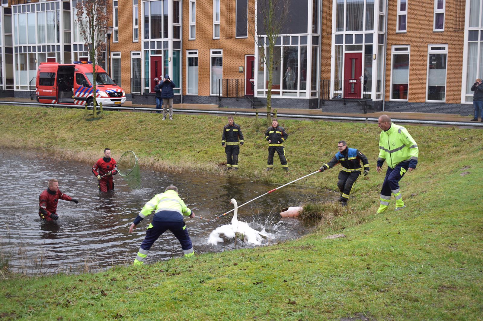 “Het gaat om zwaan Willem die een gebroken poot heeft”, vertelt incidentfotograaf Rick ten Cate van tencatefotografie.nl. “Vermoedelijk is het de zwaan die op 26 januari werd aangereden door een auto. Dit ongeluk gebeurde even verderop in De Wijert. Ondanks dat medewerkers van de Dierenambulance die avond geprobeerd hebben het dier te vangen is dat toen niet gelukt.” De afgelopen weken is het dier in de gaten gehouden en vrijdagmiddag werd besloten om in actie te komen. Hierbij werd de hulp ingeroepen van de brandweer die met duikers en een boot ter plaatse kwamen.