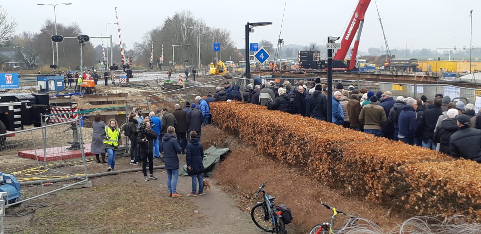 Tientallen belangstellenden uit Hurdegaryp en omgeving waren naar de bouwplaats afgereisd om de werkzaamheden met eigen ogen te kunnen aanschouwen. ProRail had speciaal voor deze mensen een tribune opgebouwd. Onder de belangstellenden ook gedeputeerde Johannes Kramer (FNP) van Verkeer en Vervoer. “Het was de bedoeling dat er alleen een traverse zou komen hier bij Hurdegaryp. Dit zorgde echter voor het nodige protest uit het dorp waardoor we op zoek zijn gegaan naar een andere oplossing. Dat is deze spooronderdoorgang geworden”, aldus de politicus. “Goed nijs foar de treinreizigers, automobilisten en de mienskip.”