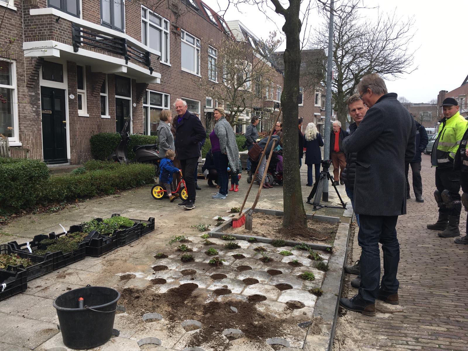 Initiatiefnemer Harry Bos is blij met het resultaat: “Na Martins presentatie raakte iedereen enthousiast over GrunnGras. Nu leggen we groene stoeptegels aan in de hele straat, helemaal tot en met de Jumbo. Maar zaterdag worden ook geveltuintjes en boomspiegels aangelegd.”