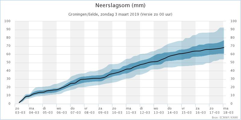 Volgens het Meteorologisch Instituut gaat er gemiddeld tijdens de eerste achttien dagen van de kalvermaand zo’n zeventig millimeter neerslag vallen. Het KNMI houdt echter wel een slag om de arm waarbij het minimum op 54 millimeter wordt berekend, en het maximum op 92. Veertien procent van de voorspelde gemiddelde neerslagsom wordt zondag al bereikt, waarbij er volgens het Instituut tien millimeter moet gaan vallen.