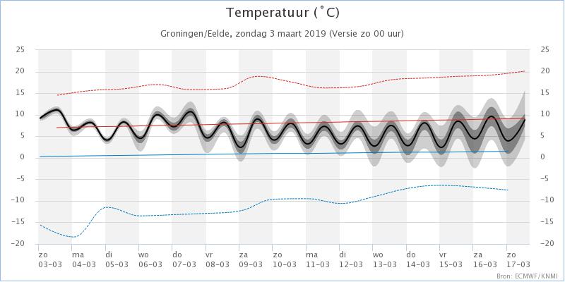 Behalve de neerslag is de rest van de voorspelling van het KNMI vrij eentonig. Tijdens de eerste twee weken loopt de temperatuur overdag op naar waarden tussen de acht en twaalf graden. ’s Nachts daalt het kwik in eerste instantie naar waarden tussen de twee en zes graden, later in de periode is nachtvorst mogelijk.