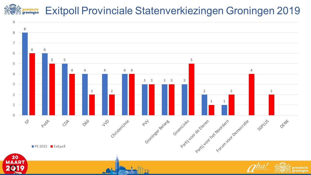 Uit de eerste exitpoll van de provincie Groningen blijkt dat de SP de grootste partij blijft met zes zetels. GroenLinks en de PvdA halen beide vijf zetels. Forum voor Democratie haalt vier zetels. Dat is evenveel als de ChristenUnie en het CDA halen.