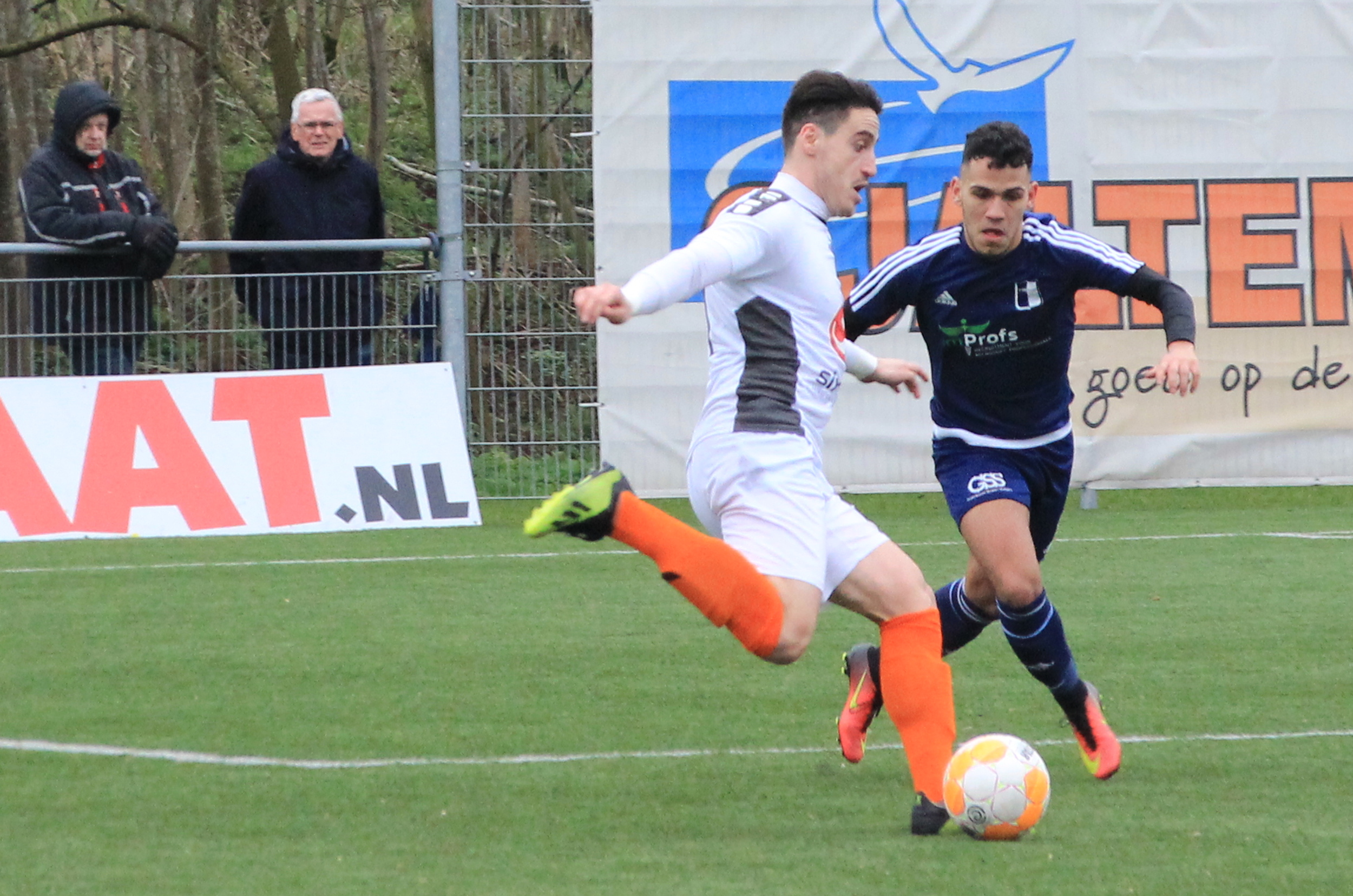 Foto Andor Heij. Erolind Derguti van ON haalt uit met Davy Wilkens van VVG in de buurt.