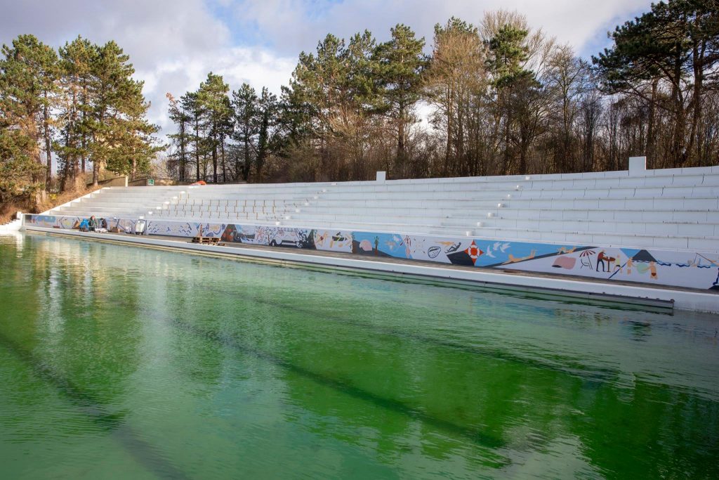 Op de tribune is in 1955 een muurschildering gemaakt. Deze is alleen talloze keren overgeschilderd. Een van de laatste klussen in de Papiermolen op dit moment is het in ere herstellen van de schildering (foto). Zaterdag 27 april tot en met vrijdag 30 augustus zal het bad geopend zijn. De voorverkoop start 8 april.