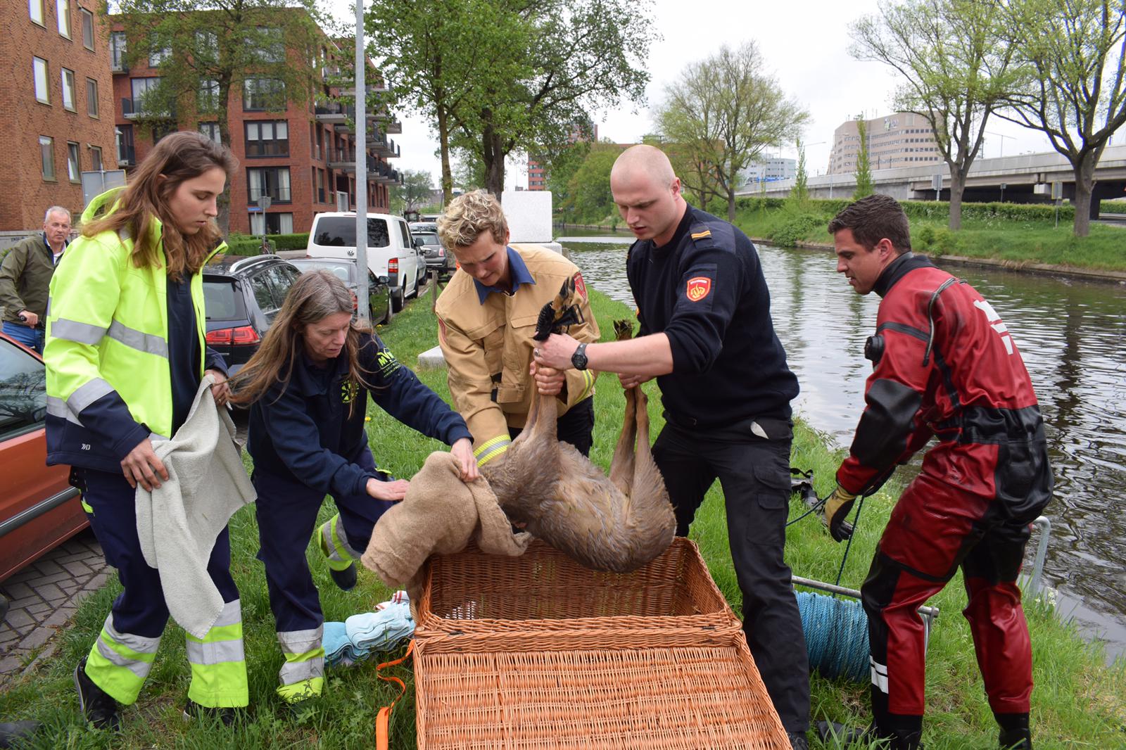 “Eenmaal aan wal liet de ree duidelijk zijn mening horen”, vertelt Ten Cate. “Ineens was er een behoorlijk geschreeuw te horen. Waarschijnlijk bedoeld als dankjewel voor de hulpverleners.” Het dier is door de Dierenambulance meegenomen naar een opvangadres.