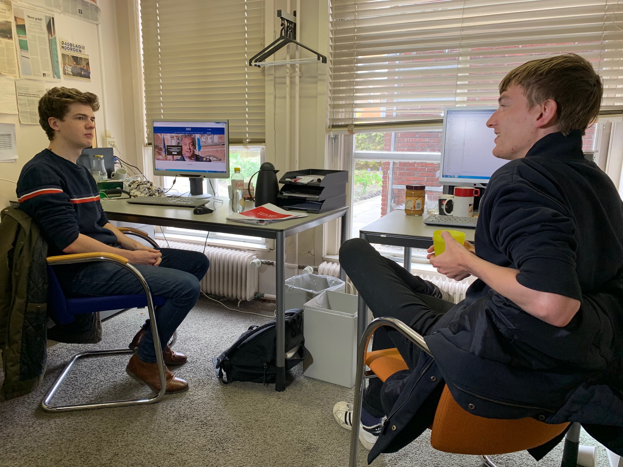 Bram Omvlee, lid-Universiteitsraad RUG namens DAG (links) en Koen Marée, persvoorlichter (rechts) - Foto: Sebastiaan Scheffer